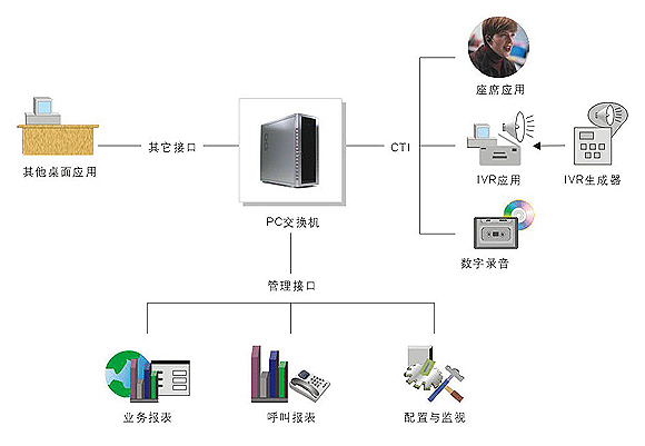 应用层屏蔽了不同体系结构集成方案的差异,提供完整应用模块,灵活开放的开发接口同业务软件集成,提供基于OCX控件的坐席端应用,和Socket方式的通讯接口,客户或集成商能够根据自身的具体应用,简单、快捷的开发出呼叫中心系统应用案例,极大降低了开发成本,进行快速集成。